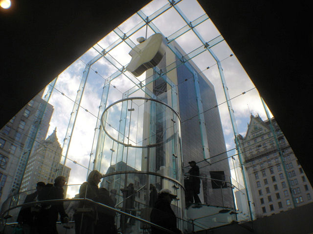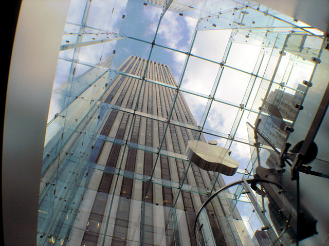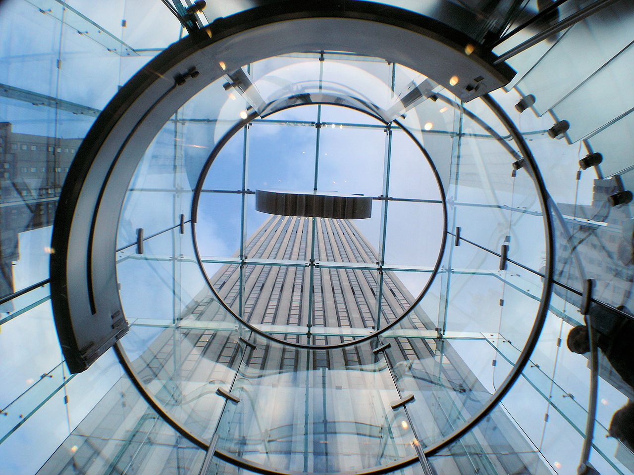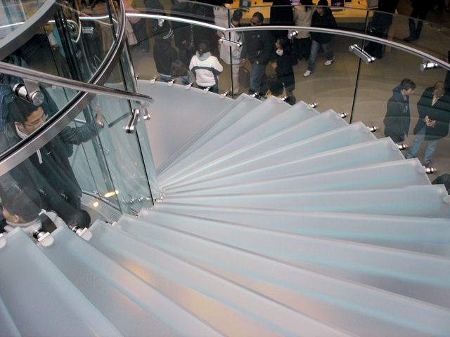 APPLE STORE NEW YORK CITY - 767 5th Avene The apple store entry is designed of structural Plexiglas. The entry cube sticks out of the ground and is the only portion of the building visible at the street level. The 20,000 square foot store is underground and it is the first Apple store to be open 24/7. An elevator and circular stair are the main features of this Plexiglas structure. A Plexiglas stair winds around the elevator shaft to the store below. It is a very exciting entry and signature! The Plexiglas colums and beams can be seen in this close up photo. The circular elevator is seen in the center of the photo. An Apple store patron on the entry landing waits for the elevator cab. People are descending into the underground Apple store on the Plexiglas stairway, wrapping around the elevator shaft. A portion of The Plaza Hotel can be seen in the background (right). Photo looking straight up from inside the elevator. The bottom of the Apple logo is seen in the center. Plexiglas stairs leading to the underground NYC Apple Store. An intermediate landing is seen in the upper left of this photo. Also, the connectors to the stair "treads" are visbile. The photo shows a closeup of the titanium hardware (elevator shaft to treads, the handrail and connectors to the glass panels). Links: NY Links: |