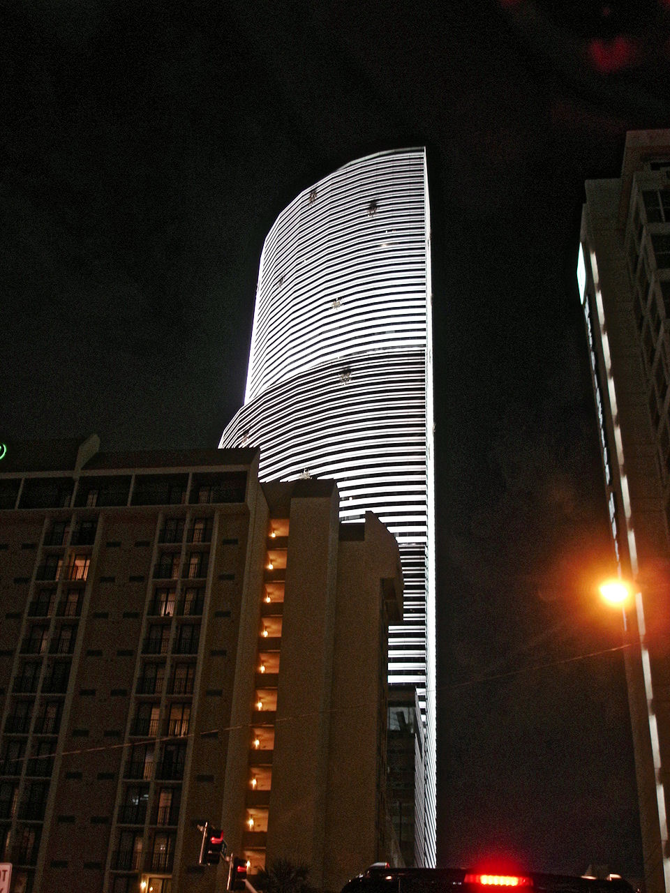 Photos of Miami-Dade County at night. Night photograpy is easy wiht today's automatic digital cameras. This was taken with an inexpensive Sony digital cameral from a a stoplight on Brickell Avenue. With a night camera setting, I was careful not to move my hand too much and there was enough light to get a decent shutter speed. The lines of the Plaza Condominium agains the cloudy black sky makes an interesting contrast. The second photo is of the Bank of America Tower (formerly the Centrust Tower) in Miami-Dade, Florida. |