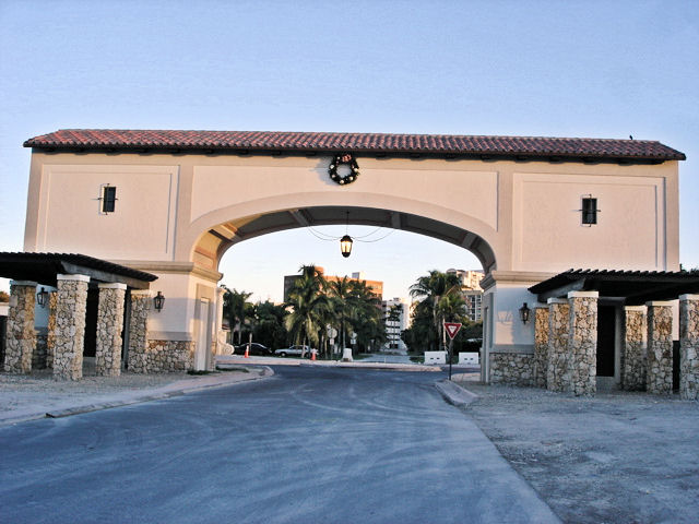 This photo of the Old Spanish Village arch was taken on January 7, 2009. The view is looking east. The arch was designed in the theme of George Merrick's entry arches.