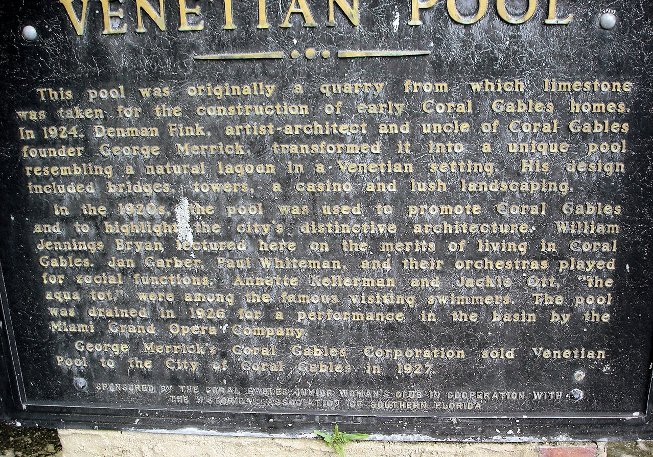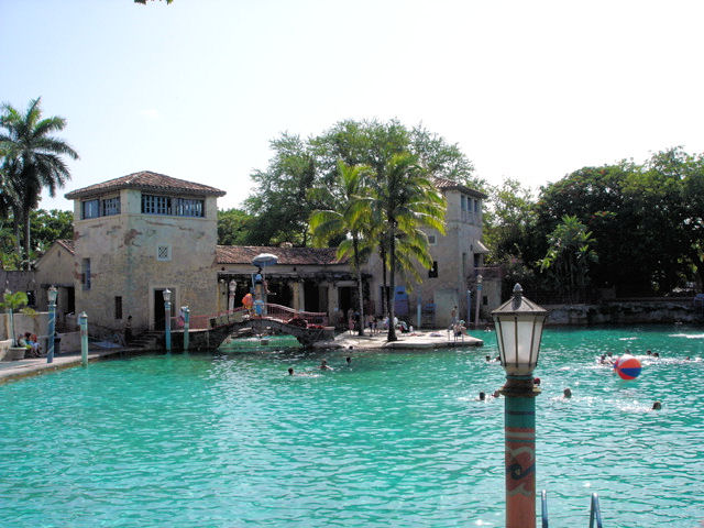 Venetian Pool, Coral Gables, FL - 2701 DeSoto Boulevard Lagoon carved of coral rock, formerly a rock quarry for the building of the first homes in George E. Merrick's Coral Gables, FL. Photo of Venetian Pool located in Coral Gables, Florida. This photo was taken from the east side of the pool looking west at the historic building, which was recently restored. Listed in the National Register of Historic Places in 1981, over 100,000 people visit the pool yearly. The pool was originally a coral rock quarry for George E. Merricks' Coral Gables Subdivision. The rock was used for the entry arches and some of the first homes in the area. It is separated into several swimming areas. A small island seen in the background of the photo separates the pool into a children's area which is shallow and connected with the steps from the historic building. An arch seen in this photo allows access to the island and a lifeguard stand. The area of the foreground is a medium depth area for stronger swimmers. The area to the right of the photo is a deeper and for advanced swimmers. The pool formerly had a dual purpose as it was drained for community events as the bottom of the pool is generally flat and smooth. A cave area not shown in this photo is popular and contains an underwater entry and shallow ledges to sit on. Several waterfalls are located on the perimeter of the pool. The city allowed diving from the top of the waterfall and later closed this area. In addition to the caves, there are stone bridges, and waterfalls. For many years the pool was a "dump and fill" pool filled with fresh water directly from Florida's underground aquifer.